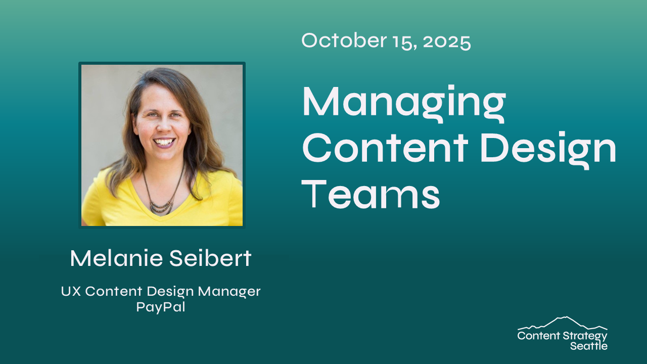 Melanie Seibert has worked as a writer in tech for 25 years, with six of those years managing content and design teams. She's built two content design teams from scratch and designed content for numerous digital products at companies like Rackspace, cPanel, Indeed, and PayPal. She is the author of Managing Content Design Teams: A Guide for Product and UX Leaders.